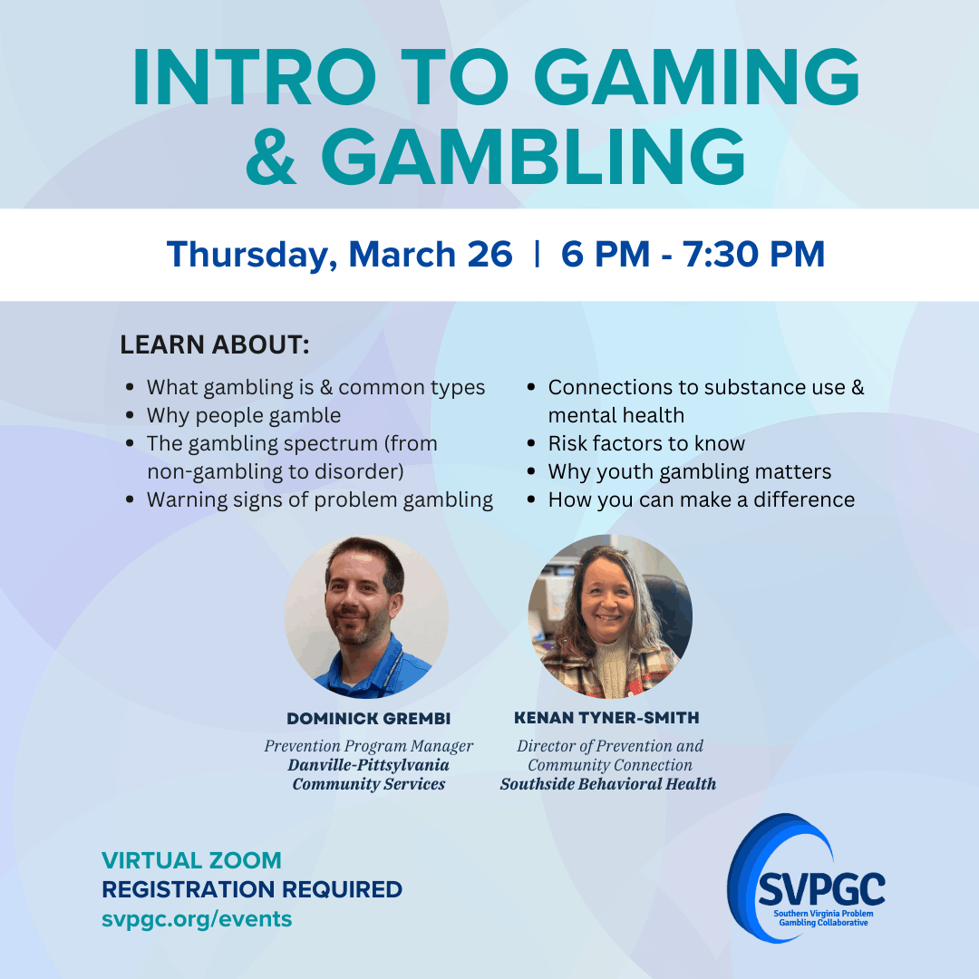 Join us Thursday, March 26th from 6pm – 7:30 pm to learn about what gambling is, common gambling types, why people gamble, warning signs of problem gambling, how you can make a difference, and more!